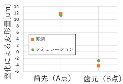 ・歯車試験片を用いた検証では、歯先および歯元位置におけるシミュレーションによる形状変化量は実測値とほぼ一致し、誤差は数マイクロン程度に収まった