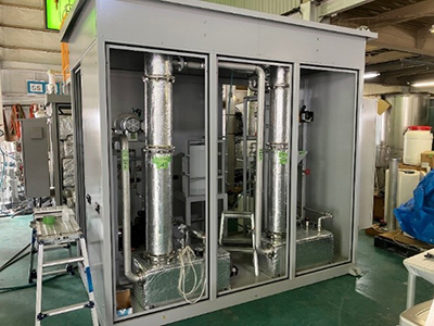 コマーシャル1号機(処理約30L/H)を完成し、性能評価を実液で達成。続いて完全ユニット化したコマーシャル2号機(W2,953mm×L1,500mm×H2,000mm)を製作し、移動・設置性を向上させた。コマーシャル機の改造などを行い、実機ベース(10T/H程度)の実機転用のデータ採取を進め、自動運転により省エネ・浄化・耐久を確認し、各ユーザーの運用条件を反映したセミコマーシャル機の設計・検証を進めている。