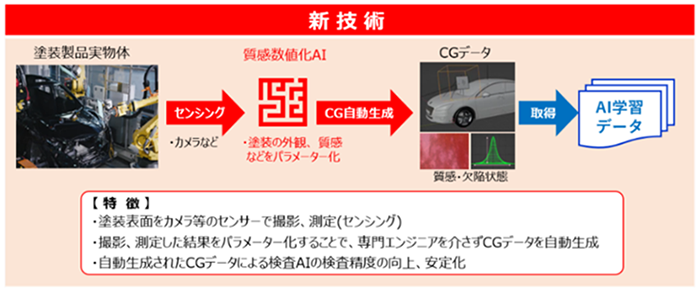 塗装製品の肌質を数値化、コンピュータグラフィックス(CG)に利用し、ぶつ・へこみ欠陥の検査AIの学習データを生成する。