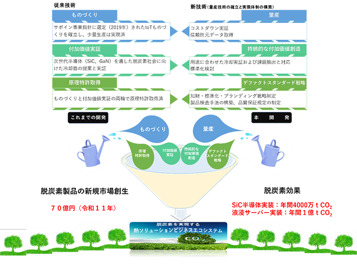 産学の連携により、量産の実証開発を行うと共に獲得した量産技術に沿って、ものづくりのコストダウンと信頼性、持続的な付加価値創造、デファクトスタンダード戦略を有機的に連携させた国際競争力を有する熱ソリューションビジネスエコシステムを共創することを目的とした。レンコンのように一方向に気孔が配列した金属材料であるロータス金属を用いて、サーバー向け、車載インバータ向けの冷却器として脱炭素の実現になくてはならない熱ソリューションを開発し、脱炭素効果を実証することを目標とした。本事業成果は、令和11年に70億円の新規冷却市場を創出し、車載用冷却器として年間4,000万tCO2削減、液浸サーバー用冷却器として1億tCO2削減を実現することを目指した。